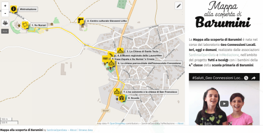 Le informazioni cartografiche del progetto e la piattaforma OpenStreetMap sono state debitamente arricchite da due diversi mapping sul campo svolti dai bambini con smartphone e taccuini. Durante il primo mapping, il pomeriggio prima della festa – il 19 maggio – i bambini hanno mappato il paese ed i suoi luoghi di interesse: aree verdi, piazze, panchine, luoghi di ritrovo, case antiche, fotografie e murales presente lungo la strada principale. Nel secondo mapping, il giorno della festa del patrono – il 20 maggio – i bambini hanno mappato tutti i particolari che trasformano il paese in un teatro coloratissimo e profumato: gli arazzi appesi alle pareti o alle finestre delle case, le decorazioni dei vari rioni, i tappeti di piante e fiori sparsi per le strade ed i tanti, tantissimi fedeli che ogni anno accorrono nel centro della Marmilla per Santu Brenardinu.